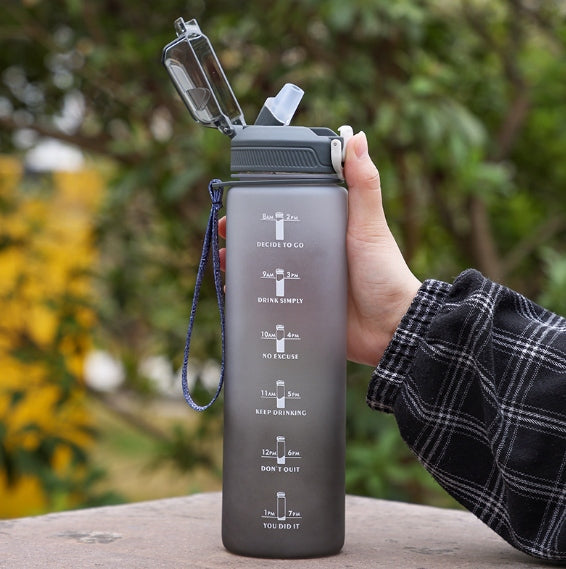 Butelka na wodę o pojemność 1 litrato idealny sposób, by pozostać nawodnionym przez cały dzień! Dzięki niej unikniesz konieczności kupowania jednorazowych butelek z wodą. Bidon wyposażony jest w praktyczny ustnik ze słomką, co sprawia, że picie z niego jest niezwykle wygodne i nie wymaga przechylania. Dodatkowo klips zabezpieczający chroni wieczko butelki przed przypadkowym otwarciem się. Miarka z godzinami i motywacyjnymi hasłami zachęca do regularnego picia wody. Wykonana została z wytrzymałego i bezpiecznego dla kontaktu z żywnością tritanu, niezawierającego BPA.