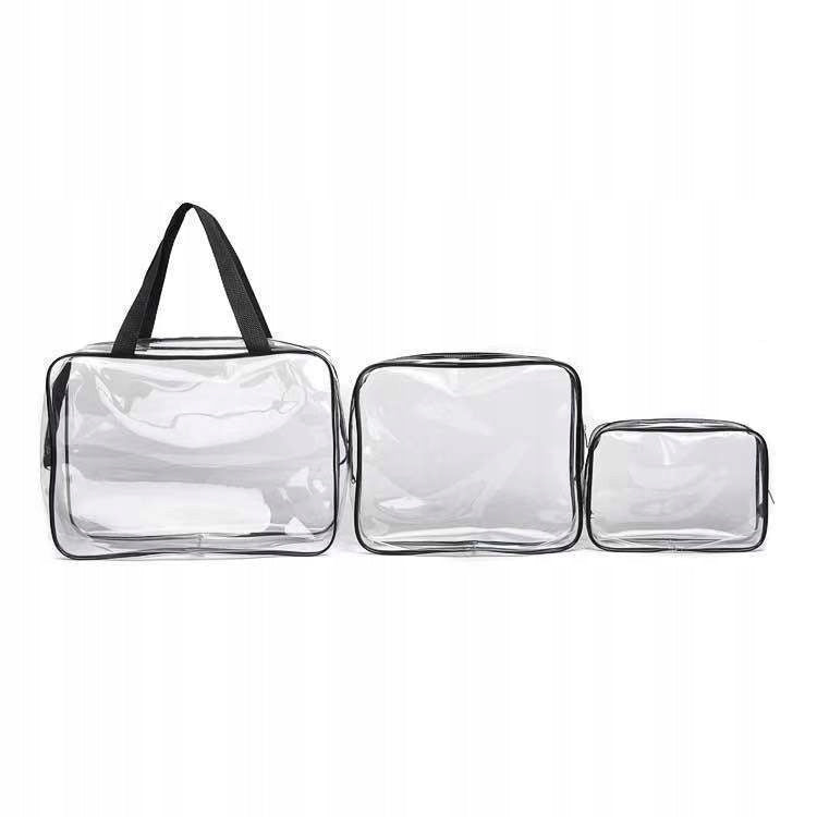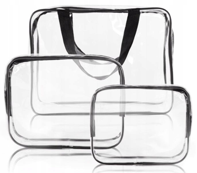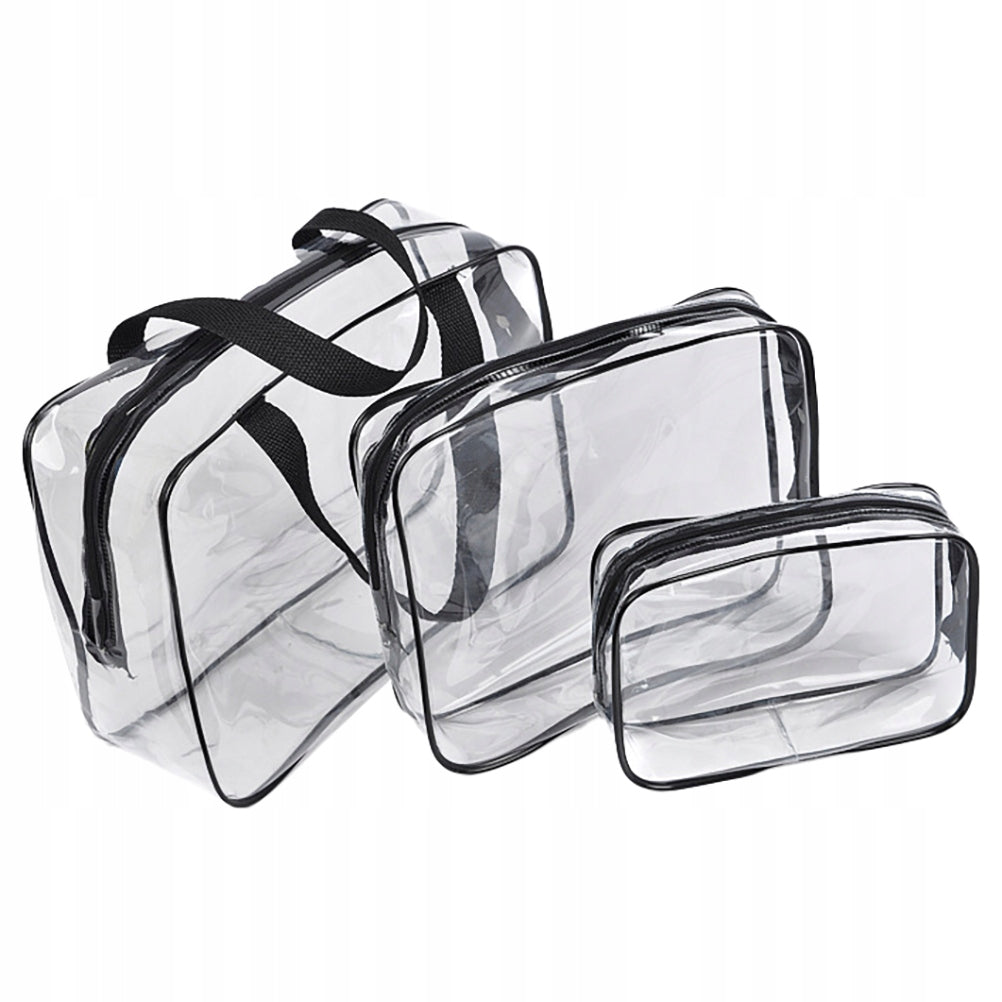 Zestaw 3w1 składa się z trzech kosmetyczek - dużej, średniej i małej. Wykonanych z przezroczystego plastiku PCV, który jest wodoszczelny i wyjątkowo łatwy w czyszczeniu. Doskonale sprawdzą się zarówno podczas podróży czy urlopu jak wizyty na basenie lub siłowni. Transparentny materiał ułatwi szybkie zlokalizowanie potrzebnego przedmiotu i przyspieszy odprawę na lotnisku. Największa kosmetyczka może służyć również jako torebka, dzięki długiemu, czarnemu uchwytowi.