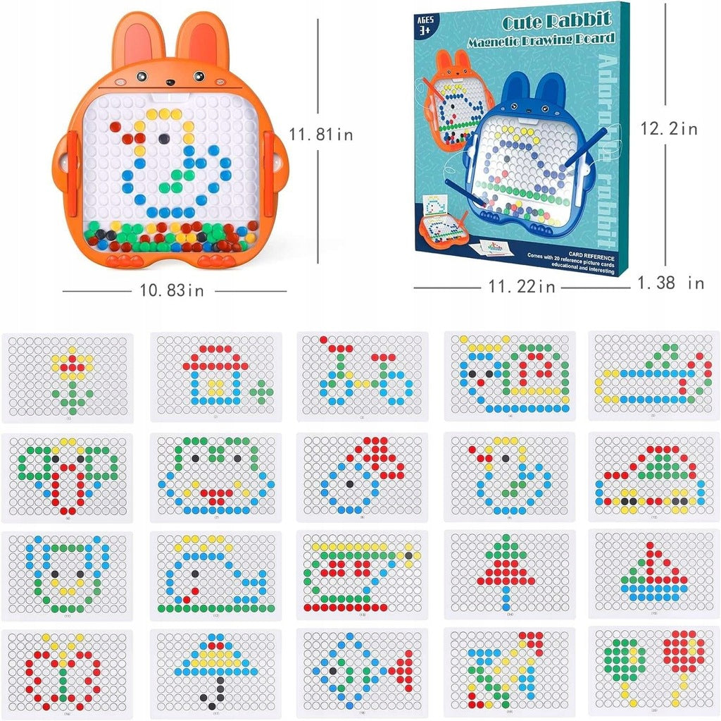 Zabawki edukacyjne i podróżne: nasza magnetyczna deska kreślarska zapewnia niekończącą się zabawę i wartość edukacyjną oraz wspiera wyobraźnię i kreatywność dziecka, jednocześnie poprawiając zdolności motoryczne. Idealny prezent na Wielkanoc, urodziny i Boże Narodzenie dla dzieci. Lekki i łatwy do przenoszenia. Nadaje się do podróży lub długich wycieczek, aby dzieci były zajęte i sprawiły, że podróż będzie przyjemna. Bezpieczny i wytrzymały materiał: Wykonany z wysokiej jakości tworzywa sztucznego ABS, zapewnia solidną i trwałą konstrukcję, która jest bezpieczna dla dzieci. Magnetyczna deska do rysowania dla dzieci ma gładkie krawędzie i miękkie krzywizny, co sprawia, że jest to bezpieczny wybór dla małych dzieci. Zamknięte koraliki magnetyczne pomagają uniknąć ryzyka połknięcia przez dzieci. Podwójne magnetyczne długopisy i miejsce na karty: Nasza magnetyczna deska kreślarska jest dostarczana z dwoma magnetycznymi kołkami, które są bezpiecznie przymocowane do deski za pomocą wytrzymałej liny, co czyni ją idealną do aktywności rodziców i dzieci. Dzięki praktycznej konstrukcji z miejscem na karty dzieci mogą łatwo sprawdzić wzór karty, gdy tylko zostanie włożony. Nasza magnetyczna deska kreślarska to zabawna gra edukacyjna. Bogate, zabawne wzory i kolorowe koraliki magnetyczne: dzięki 10 dwustronnym kartkom i łącznie 20 wzorom Twoje maluchy spędzą niekończące się godziny na odkrywaniu różnorodnych wzorów - od prostych po wymagające. Żywe kolory koralików magnetycznych przyciągają uwagę i wzbudzą ciekawość, jednocześnie poprawiając zdolności poznawcze. Odblokuj kreatywność swojego dziecka dzięki naszej magnetycznej zabawce do rysowania. Urocze wzornictwo królika i duży rozmiar: Rozmiar magnetycznej deski kreślarskiej wynosi 29 cm długości i 31 cm wysokości. Ta deska do malowania zapewnia dziecku wystarczająco dużo miejsca, aby uwolnić jego kreatywność i wyobraźnię. Twoje dziecko będzie miało wspaniały czas, przesuwając kolorowe koraliki magnetyczne, aby stworzyć wyjątkowe wzory i wzory, rozwijając jednocześnie ważne umiejętności, takie jak koordynacja ręka oko i motoryka precyzyjna.