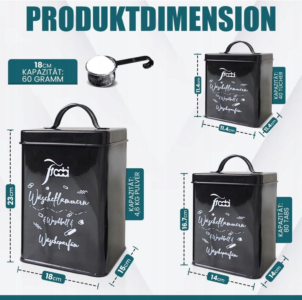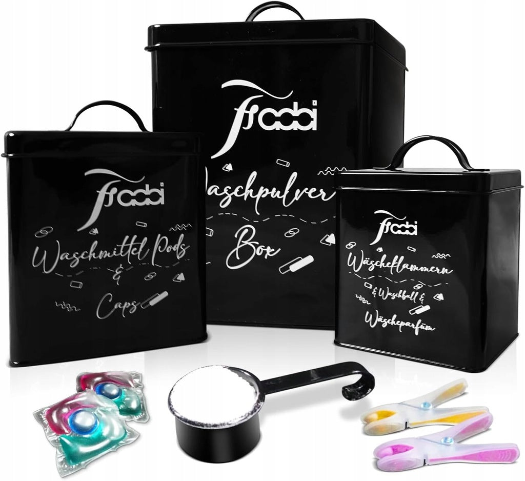 Faabi zestaw do przechowywania środków piorących zawiera trzy pojemniki na środki piorące w różnych rozmiarach (15,5 x 18 x 23 cm, 14 x 14 x 16,6 cm, 11,3 x 11,3 x 13,7 cm) i pomoc w dozowaniu proszku do prania, kapsułek, spinaczy do bielizn