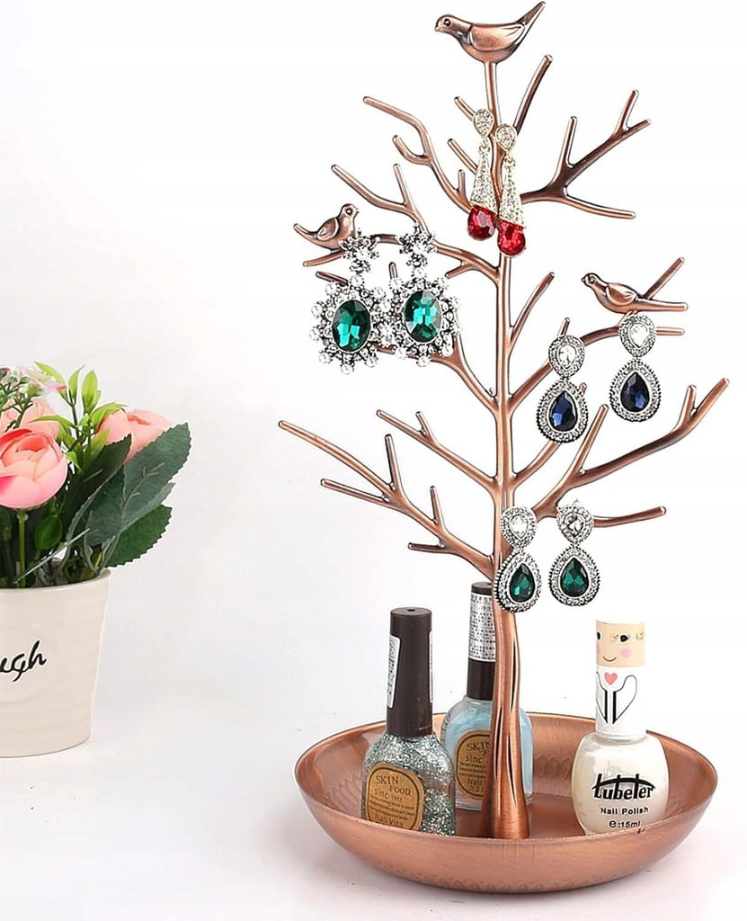 - Stojak na biżuterię. Gałęzie drzewa są idealne do przechowywania naszyjników, bransoletek, kolczyków, pierścionków. Na podstawie tacy na biżuterię możesz również umieścić wiele innych ozdób. Nie będziesz już musiał martwić się o utratę biżuterii.