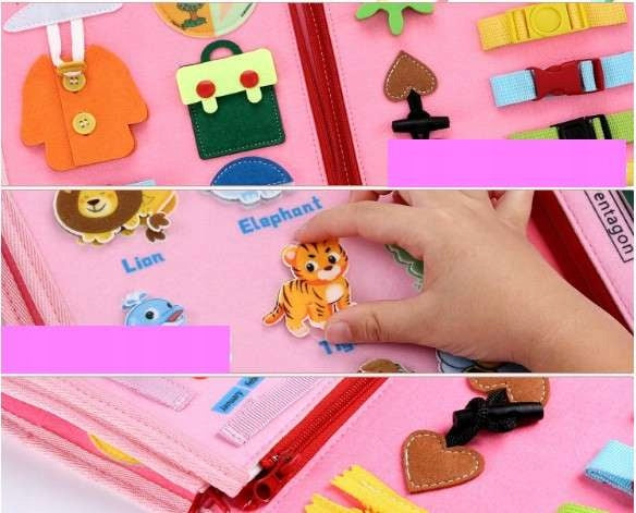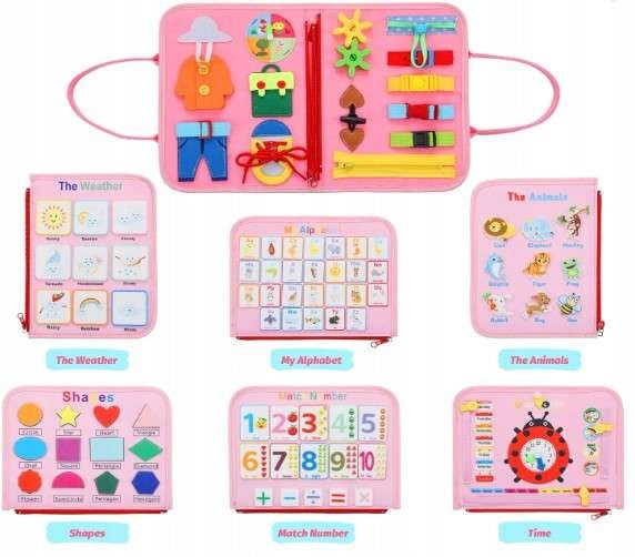 - 8 W 1 ZABAWKI DLA MALUCHÓW: 8 stron różnych tematów zajęć dla maluchów na tej tablicy z aktywnościami dla maluchów, zamki błyskawiczne, sznurowadła, paski, guziki, zegary, dni tygodnia, pory roku, miesiące, dopasowywanie kształtów, pogoda, liczby, litery szydełkowe, układanka ze zwierzętami itp. Ta tablica z aktywnościami dla maluchów została zaprojektowana na różnych poziomach trudności, aby rzucić wyzwanie maluchom, ale nie przytłoczyć ich, aby utrzymać ich zainteresowanie.