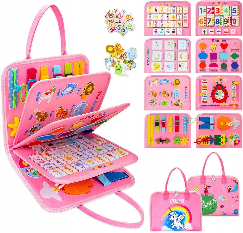 Tablica manipulacyjna książeczka sensoryczna Montessori edukacyjna różowa