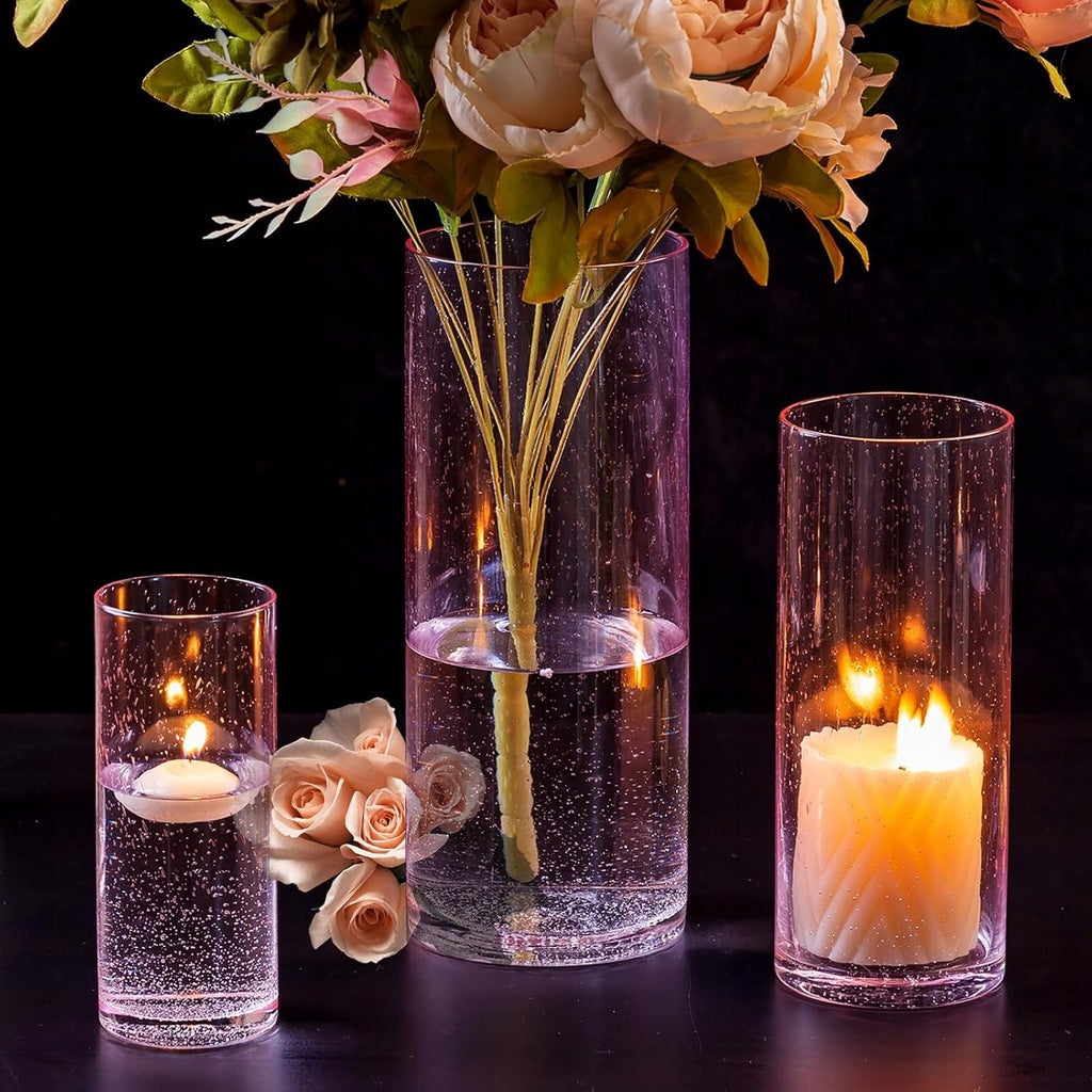 - 【Różne rozmiary】Te szklane świeczniki przeciwhuraganowe w 3 różnych rozmiarach: 3,9*9,8 cala, 3,1*7,9 cala, 2,4*5,9 cala (10*25 cm, 8*20 cm, 6*15 cm), odpowiednie do świec pływających, świec filarowych, podgrzewaczy, świec wotywnych i świec bezpłomieniowych. Opakowanie zawiera: 3 sztuki różnych wazonów cylindrycznych, świece nie są dołączone.