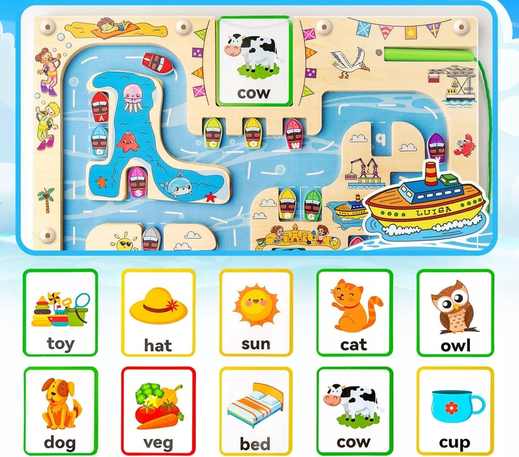- 【Magnetyczna gra w dopasowywanie słów i liter】 Ten drewniany labirynt magnetyczny o wymiarach 29,5 cm x 29,5 cm jest odpowiedni dla małych dzieci w wieku 2–5 lat. Jest to kolorowa gra polegająca na labiryncie alfabetu i kolorów z długopisem magnetycznym, 20 kartami i 24 literami łódek magnetycznych. Każda łódka w labiryncie jest oznaczona literami, dzięki czemu Twoje dziecko może z łatwością sortować i dopasowywać według liter.