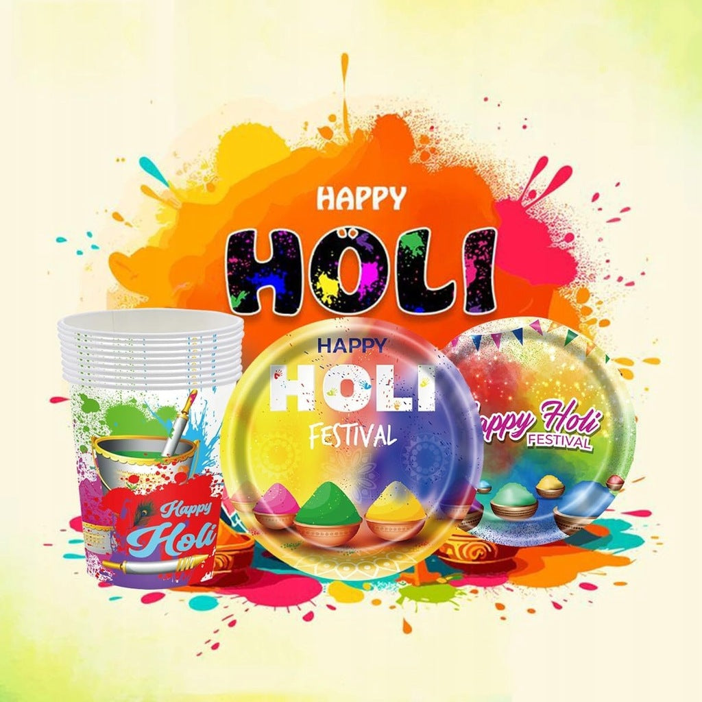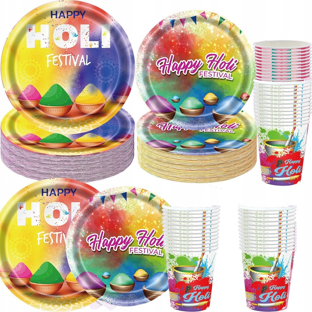 - Kolor za liniami Szczęśliwego Holi India Festival of Color: Pakiet zawiera 24 talerze paryskie o średnicy 7 cali, 24 talerze paryskie o średnicy 9 cali, 24 kubki paryskie na imprezę. Łącznie 72 zestawy na imprezę