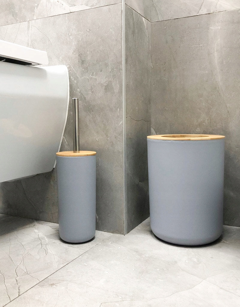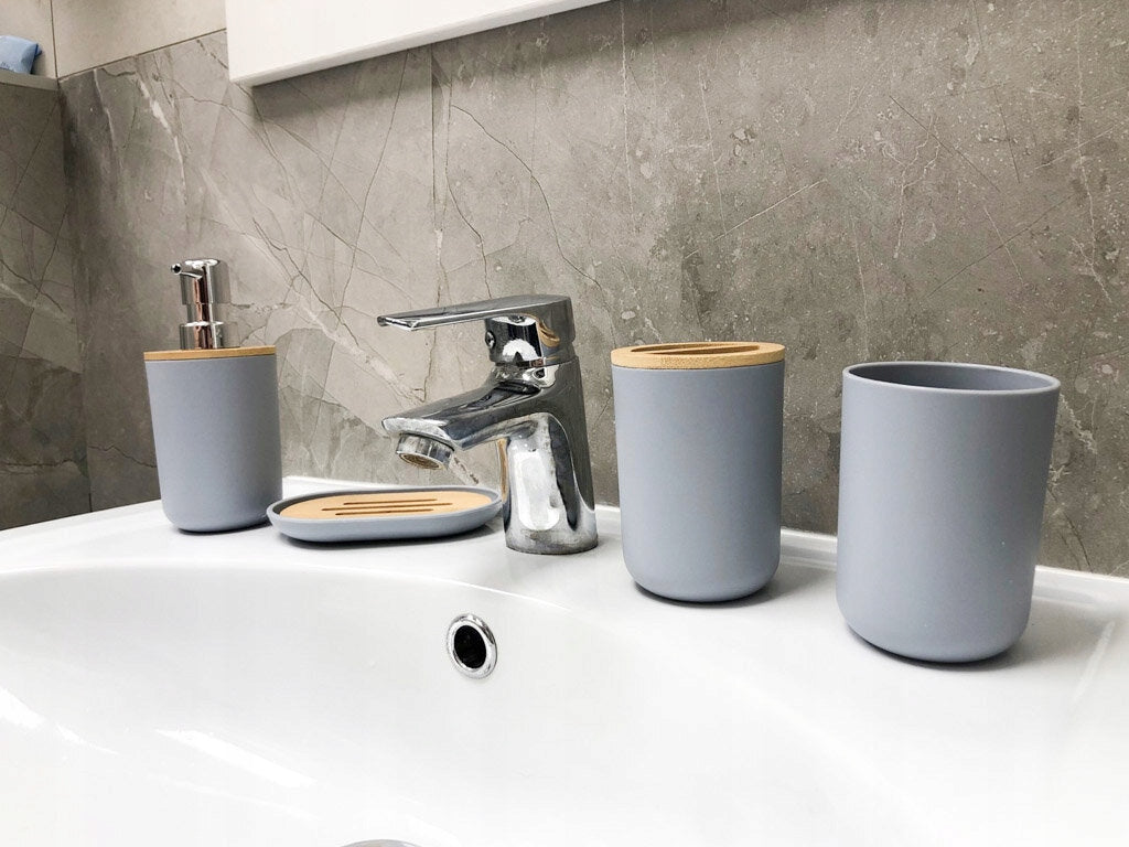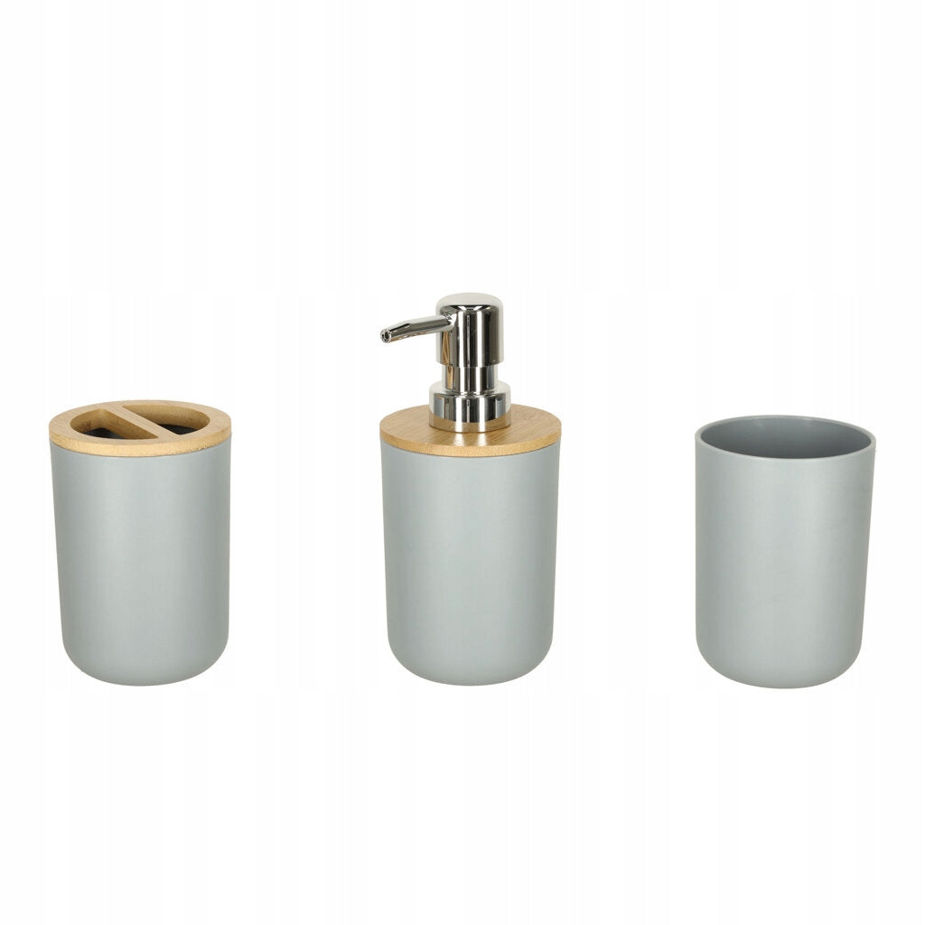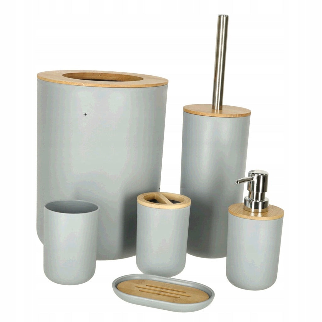 Mamy dla Ciebie idealną propozycję!Sześcioelementowy zestaw łazienkowyw szarym kolorze to doskonały sposób na stworzenie spójnej i stylowe aranżacji. Połączenie wysokiej jakości materiałów i starannego wykonania sprawia, że zestaw ten będzie pełnić funkcję nie tylko użytkową, ale także ozdobą.W skład zestawu wchodzą:dozownik do mydła, pojemnik na szczoteczki do zębów, mydelniczka, kubek, szczotka toaletowa z pojemnikiem oraz kosz na śmieci.Wszystkie elementy zestawu wykonane są z wytrzymałego plastiku i utrzymane w szarej kolorystyce, która doskonale komponuje się z różnymi stylami wnętrz. Dodatkowe drewniane detale nadają zestawowi nowoczesnego wyglądu.Produkt zapakowany w kartonowe opakowanie.
